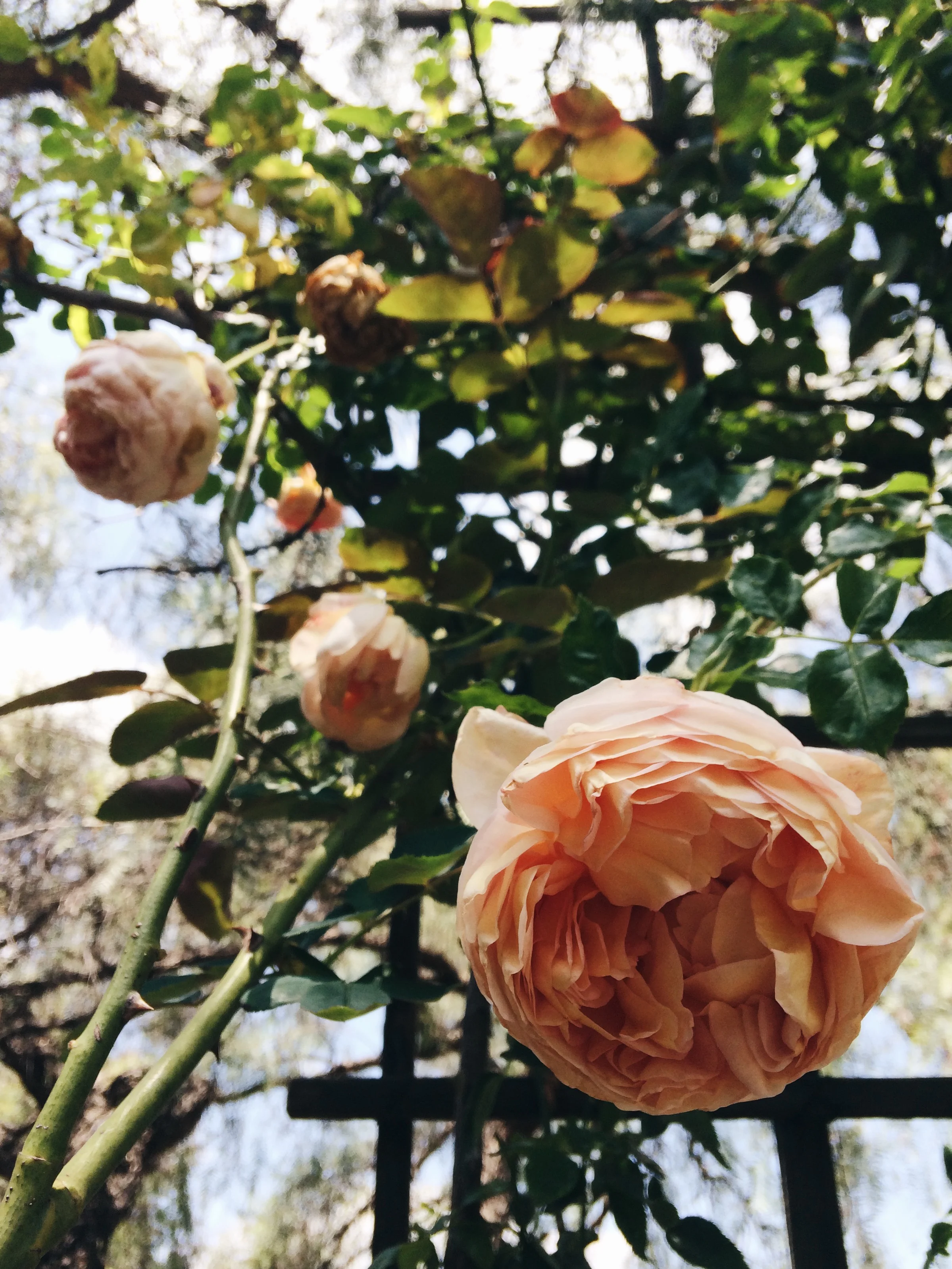 my landlady's garden is a sight and a scent to behold. it overflows with greenery at all times, including both the accidental plantings that sprout each year and the new flowers and fruits that she continues to plant. i enjoy the rose bushes most, which are beautifully arranged in color order, from white to red to yellows and oranges to pink.